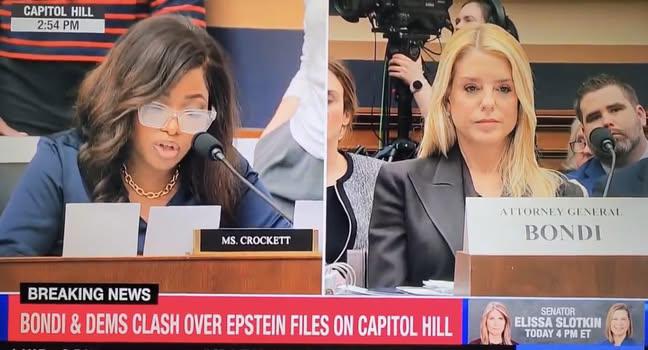 Rep. Jasmine Crockett closes with a perfect read on Pam Bondi: “The fact of the matter is you will be remembered as one of the worst attorney generals in history, an attorney general who has prioritized obstruction of justice, corruption over the law, fealty to the president over loyalty to the constitution.”